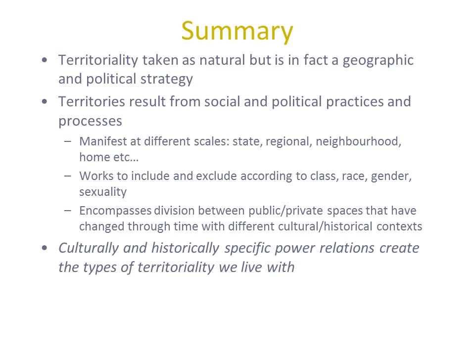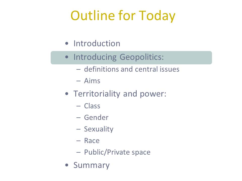 Currently I am teaching a first year Geopolitics module, as this provides some of the theoretical and historical background to the Geographies of Development course I teach at second year. This doesn’t mean you are flitting from example to example in your snappiness: I use lectures to introduce key ideas through a particular extended example. In my current module, we cover key moments in geopolitics such as the birth of the nation state (full lecture), and the Cold War (half a lecture, tied with theories of heartland and organic state geopolitics), as well as introductions to how this applies in current events: geopolitics of climate change (whole lecture), and feminist geopolitics in childbirth (half lecture, with intro to ‘feminist geography’ more broadly). What I mean by ‘snappy’ is that you are not using your class to do grounded original analysis (perhaps like what you might do with a graduate class), you are mostly presenting an introduction to the field through the well distilled results of other peoples work.